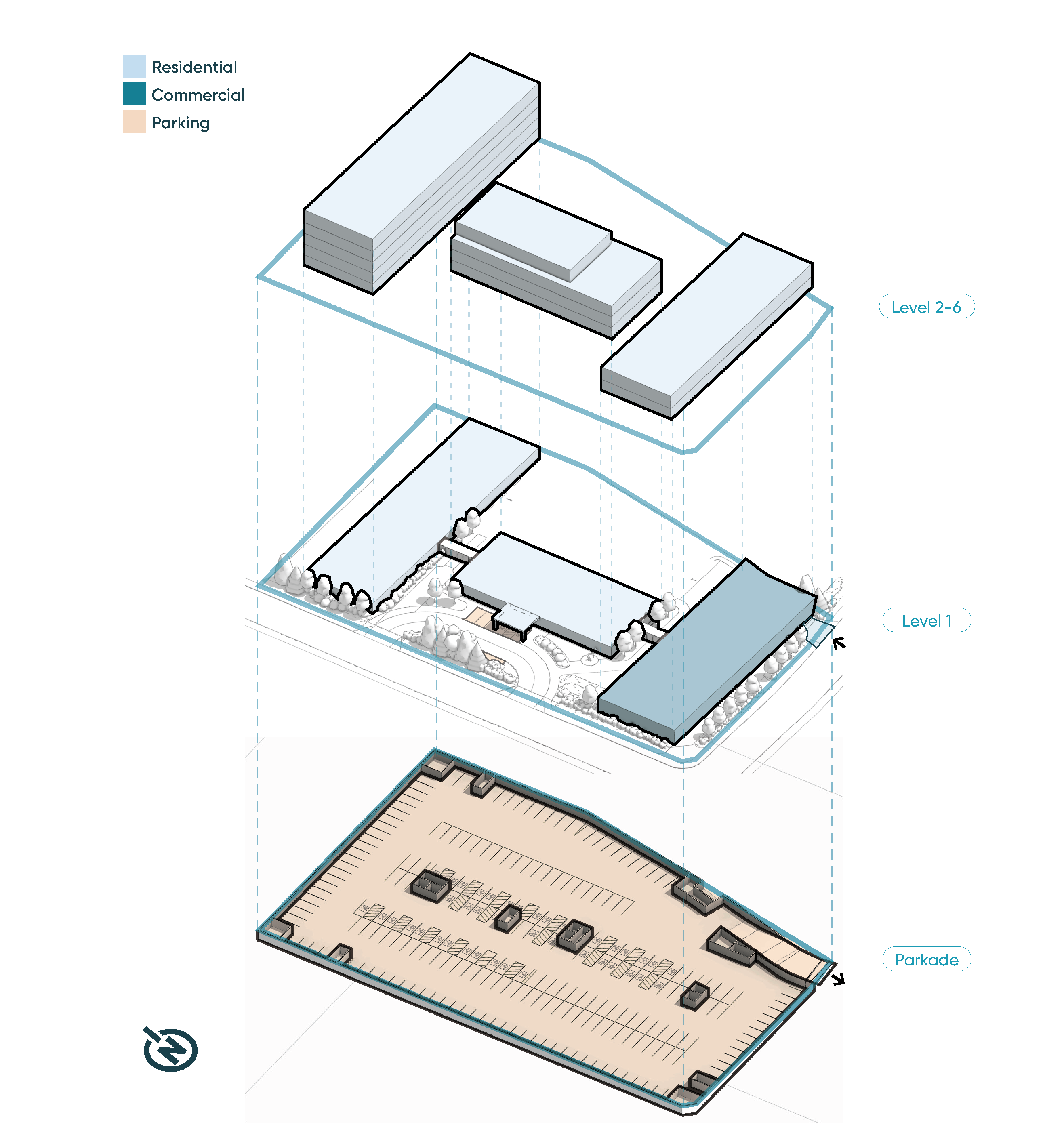 Secure, underground parkade servicing all three buildings on site to offer abundant vehicular parking.